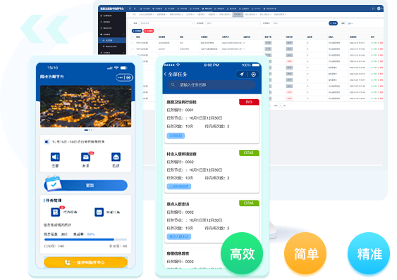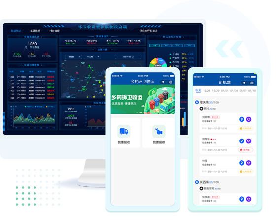 环卫收运系统整合村官、环卫工作者、管护公司、政府管理部门,四位一体,线上任务派发、任务接受、任务管理、实时环卫人员车辆定位,任务进度可视,实现全过程环卫闭环管理