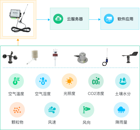 气象监测系统,将温湿度、气压、光照强度、光合有效辐射、CO2、风向、蒸发量、风速、雨量、地温、地湿、ph,总辐射、PM2.5、氨气、日照时数、紫外辐射、雨雪、净辐射数据通过GPRS/WIFI实时传输至乡村IOT平台。可选择传感器和时间段,以图形的方式展示供专业人员分析,可选择时间段,以列表的方式展示所有传感器数据供专业人员分析。