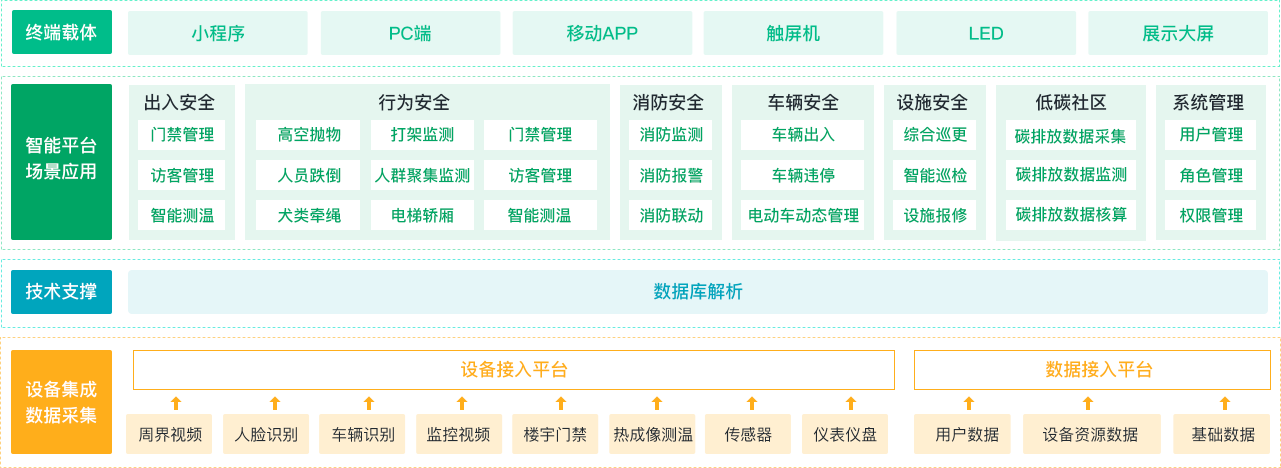融合智慧乡村场景下的人、事、地、物、组织等多种数据资源,通过物联网与人工智能对环境 实时监控、自动预警,提升社区安全等级;通过大数据、云计算实现资源整合、数据共享,为乡村提供综合安防治理、电子巡更服务,规范防控行为,强化巡查质量。助力新型平安乡村、文名乡村、的建设。